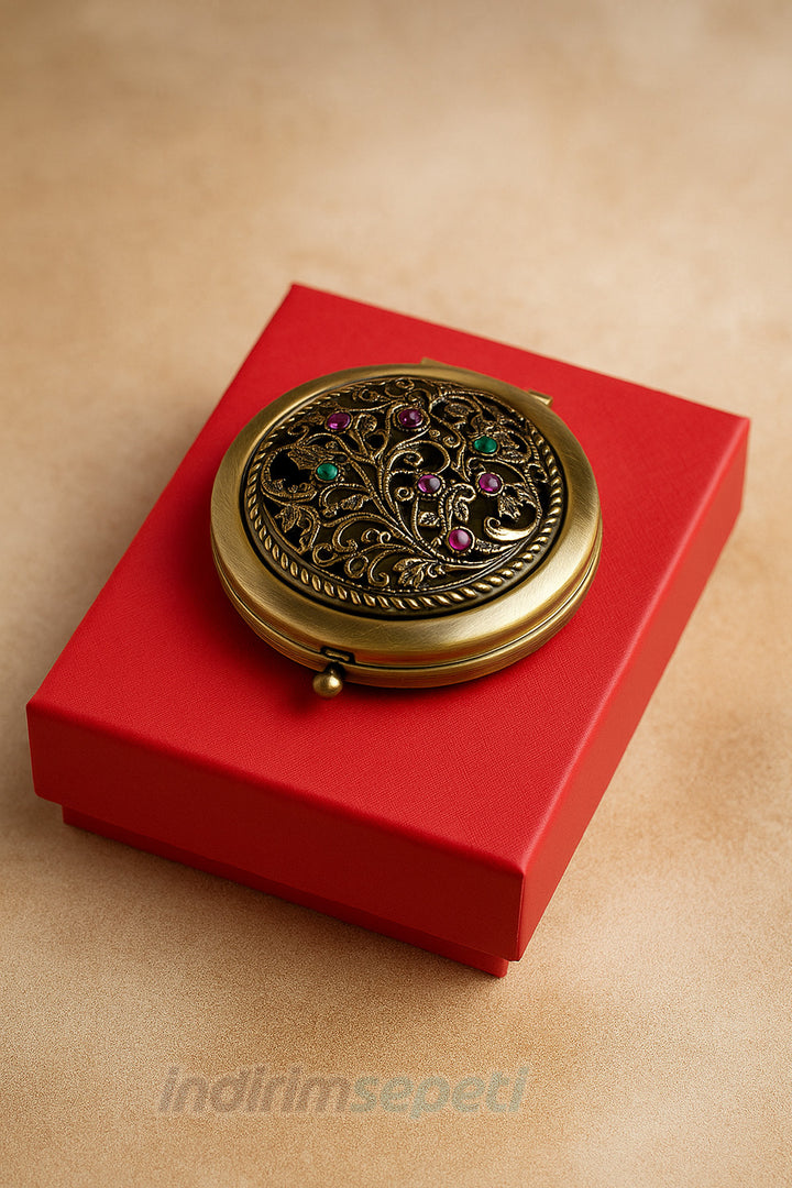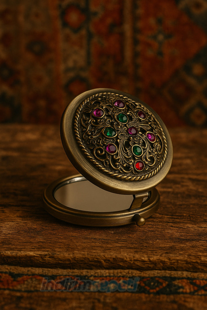 Indirimsepeti Makyaj Aynası Vintage İşlemeli Taşlı Metal Çift Taraflı Cep Aynası – Hediyelik Çanta İçi Taşınabilir Ayna